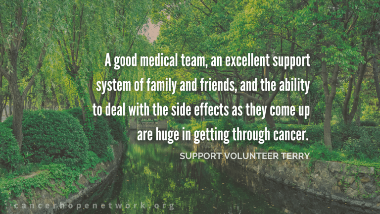 To get matched with a cancer survivor or cancer caregiver mentor who understands, call 877-HOPENET or visit cancerhopenetwork.org/support.